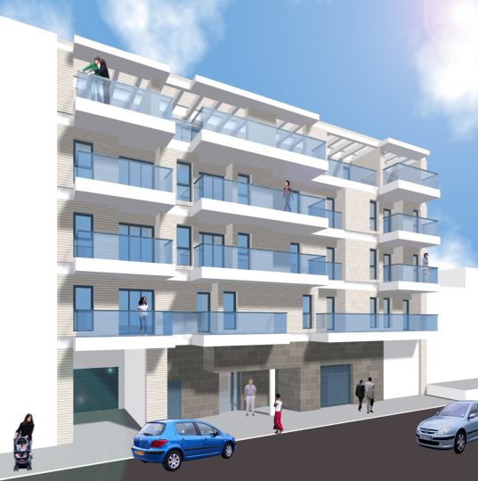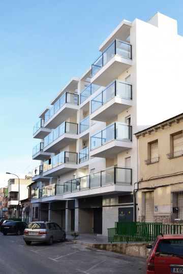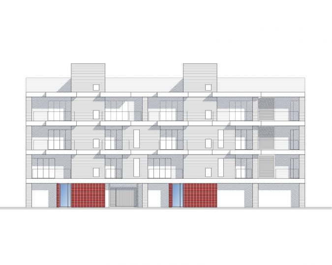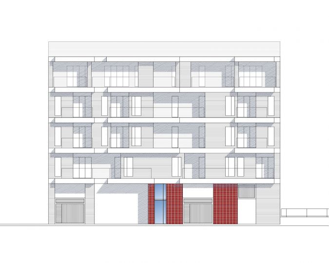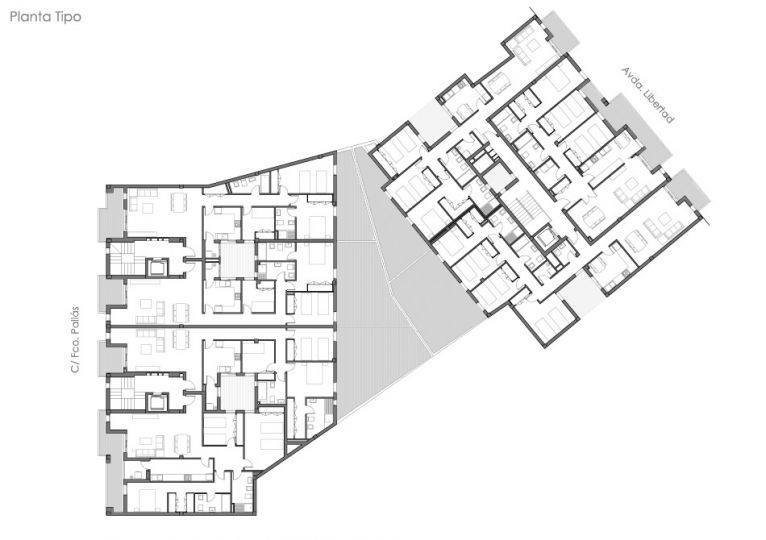 Planteamos la construcción de dos bloque, dejando un gran patio central y unidos por una planta baja donde se combinan los locales comerciales con los aparcamientos. En el bloque con acceso desde la calle Francisco Pallás se desarrollan 12 viviendas, con dos núcleos de escalera, mientras que el bloque con fachada a la Avenida Libertad un único núcleo de comunicación da servicio a 11 viviendas.