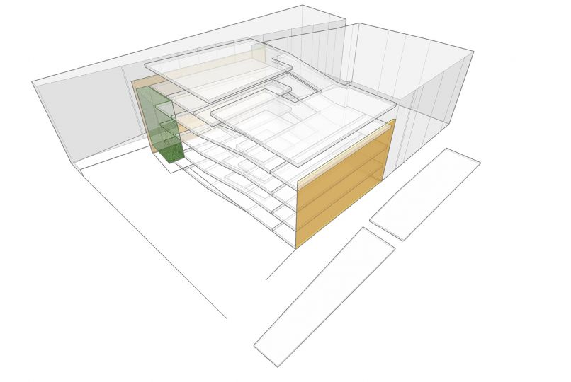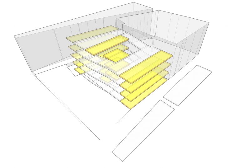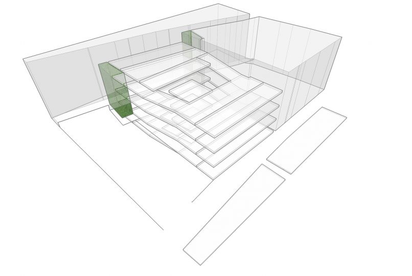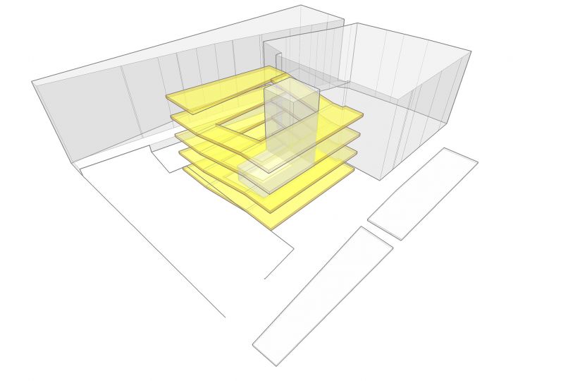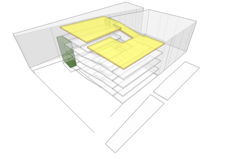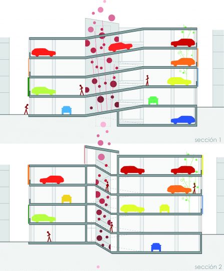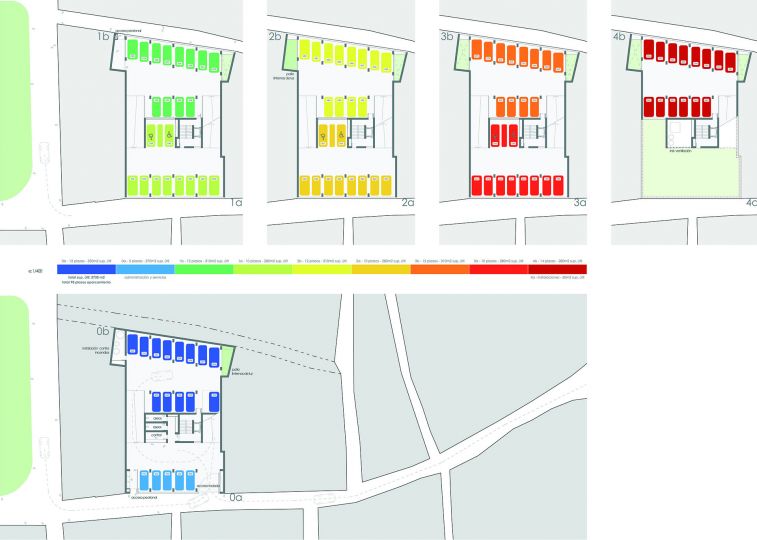 Las reducidas dimensiones y la forma irregular del solar hacía complicado organizar las plazas de aparcamiento. Con estas premisas y teniendo en cuenta el desnivel existente, desarrollamos un aparcamiento formado por semiplantas, plataformas que van ascendiendo gradualmente formando una espiral. Un núcleo central de comunicaciones y servicios sirve como tronco vertebrador y de conexión de todas la plantas. Un elemento que facilitará el buen funcionamiento del parking es la creación de una señalética interior que va cambiando de color según ascendemos, desde los colores fríos a colores más cálidos, identificando cada una de las plantas con un color determinado.