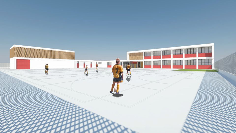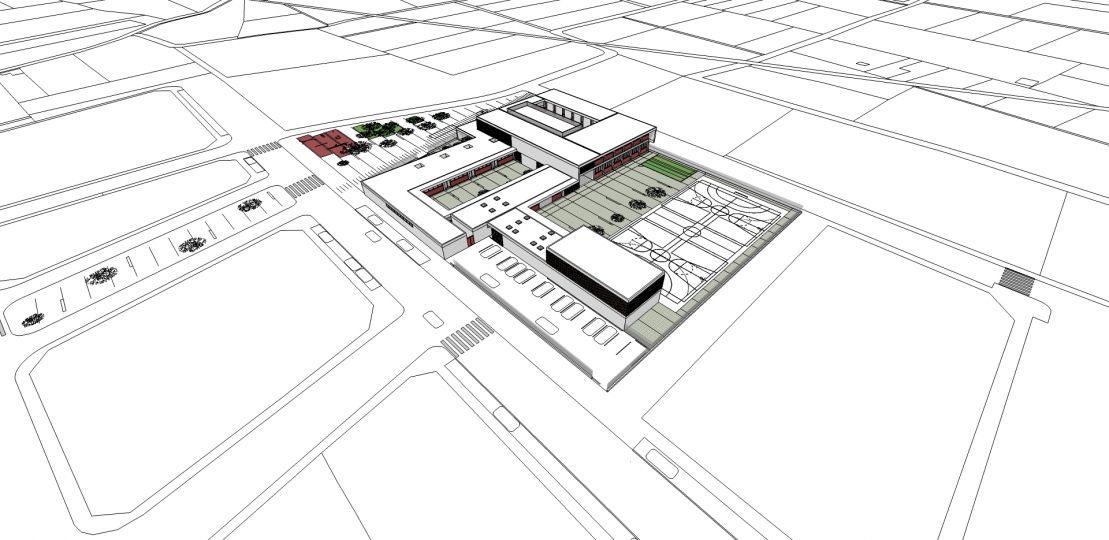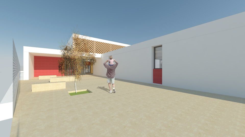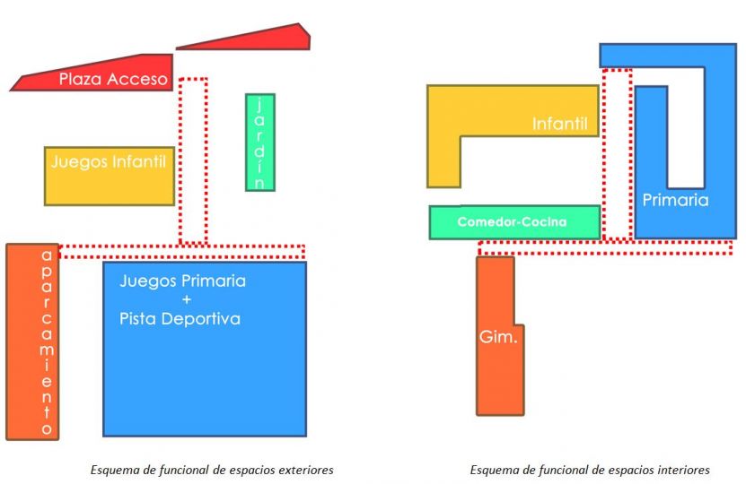 Planteamos la creación de una edificación con un sencillo esquema geométrico, que se desarrollará principalmente en planta baja, excepto la zona de aulas de primaria que se desarrolla en dos alturas. La diferenciación de usos es muy clara, permitiendo un uso independiente y sin trasferencia entre la zona de educación infantil y la de educación primaria. Un gran porche sirve de nexo de unión y conexión de los diferentes espacios, para crear un conjunto continuo y de fácil funcionamiento.