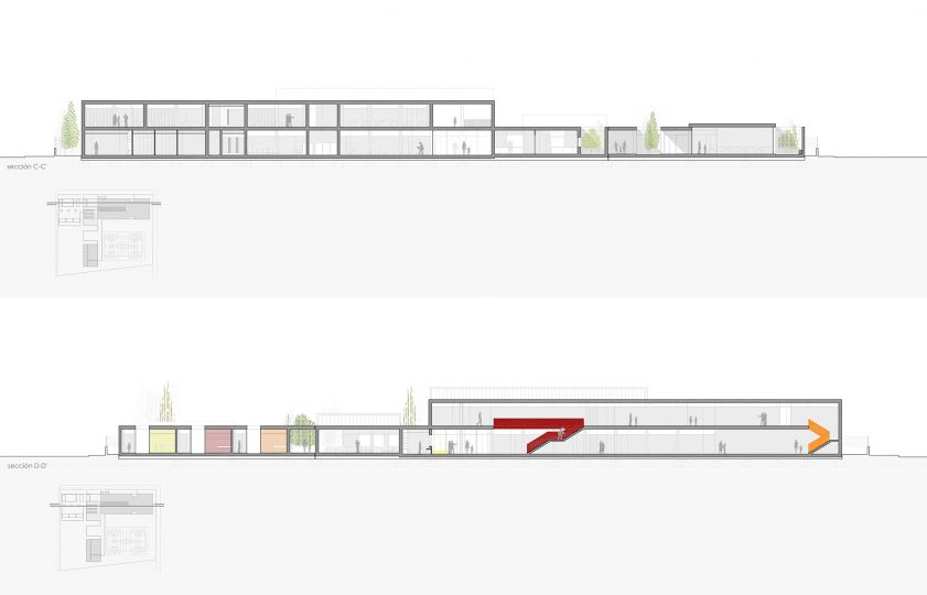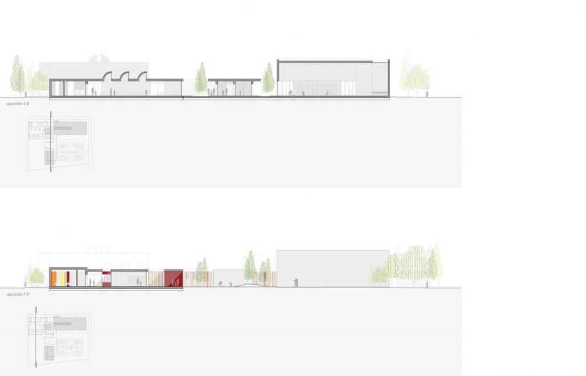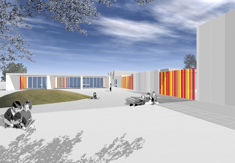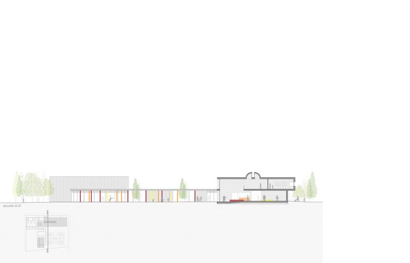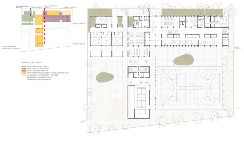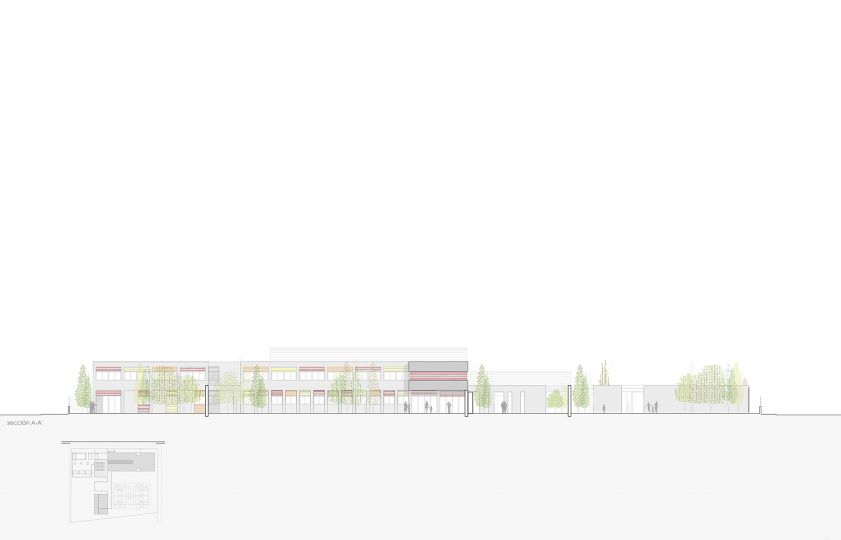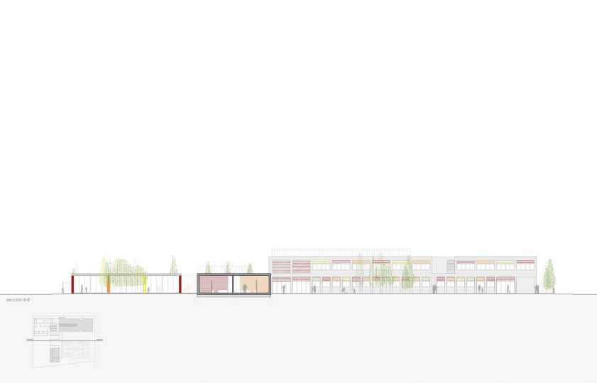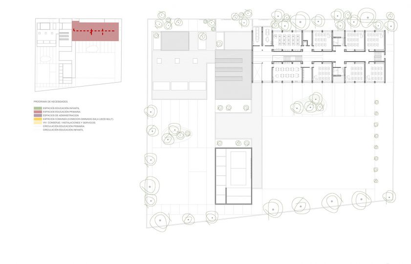 A lo largo de su historia, el centro ha sufrido diferentes adecuaciones que han sobresaturado sus espacios y le han restado carácter y funcionalidad. Reestructuramos interiormente el edificio existente, adecuándolo a los nuevos requisitos docentes, con los usos comunes y administrativos en planta baja y las aulas de primaria en planta primera. El nuevo bloque de infantil se plantea como una prolongación del existente, utilizando como filtro el comedor.