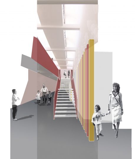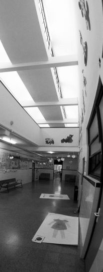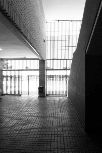Para dividir los espacios exteriores de primaria e infantil utilizamos el nuevo gimnasio, que crece en el patio de juegos como un gran volumen exento. Recuperamos el acceso como porche exterior cubierto, sirviendo como filtro entre el espacio público y el interior privado.