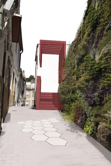 El conjunto se completa utilizando la vegetación como material que cubre las superficies de las laderas sobre las que se asienta el castillo. Éstas se cubren con un jardín vertical de arbustos autóctonos de la zona, que proporciona una singular fachada a la vez que aumenta la calidad del aire y la adición de un elemento estético sorprendente. Similar a un enrejado, éste se forma mediante un entramado de cables que  apoyan y facilitan el crecimiento de  las plantas.