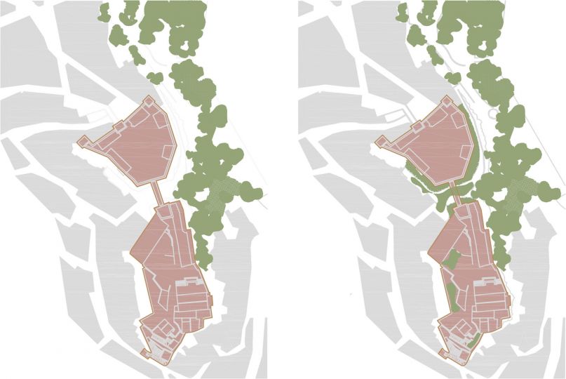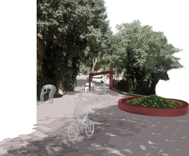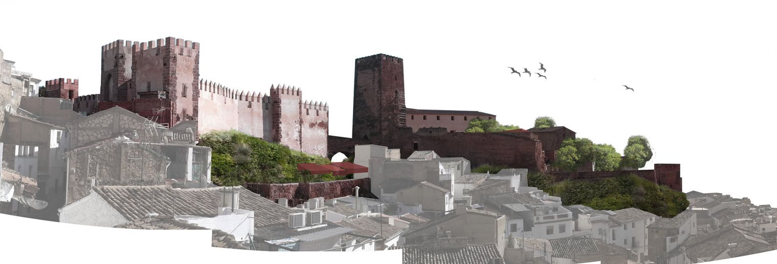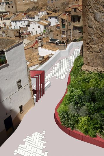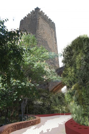 Otra de las premisas que se han tenido en cuenta en la propuesta es romper la barrera visual que supone el Castillo, entre el parque de Borrunes y el centro histórico de la población. Planteamos la expansión del espacio verde del parque, la vegetación invadirá las laderas del macizo sobre el que se asienta el Castillo, generando un jardín vertical, que se irá expandiendo hacia el pueblo.
