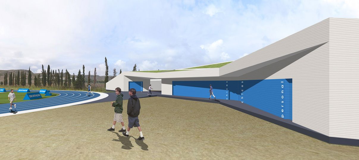La nueva zona deportiva se complementa con edificio de vestuarios, almacén e instalaciones, ya que actualmente carece de ello. Esta nueva edificación sirve de “puerta” del nuevo complejo deportivo a demás de fomentar el carácter ecológico de la actuación.