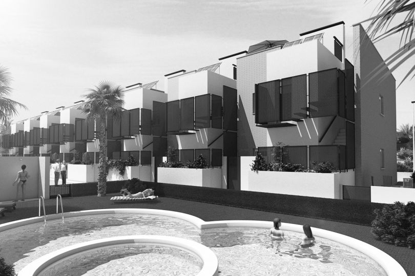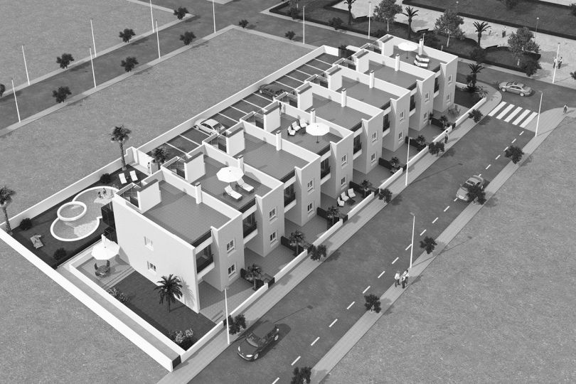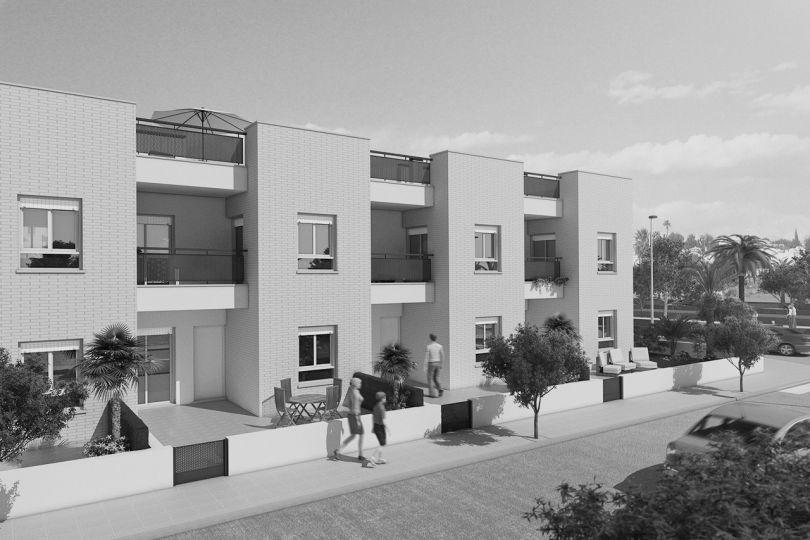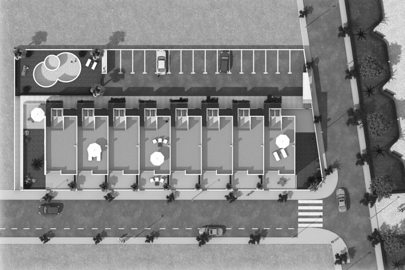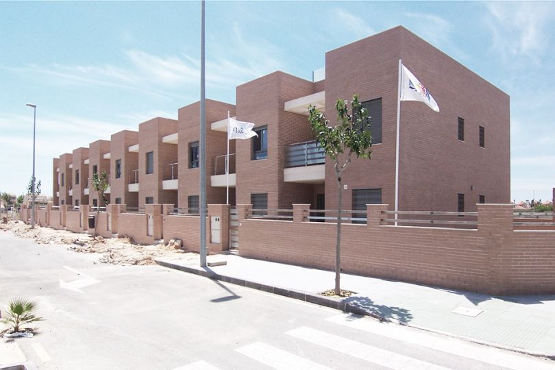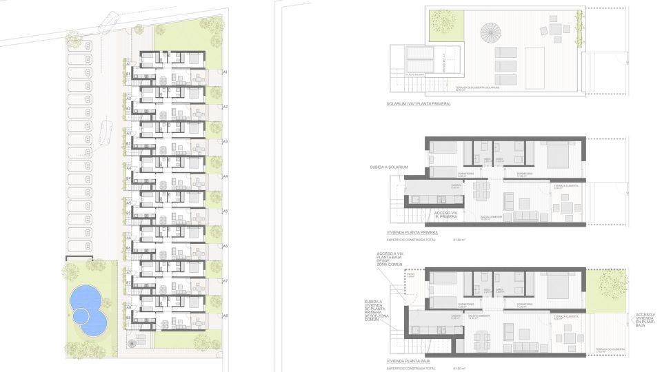 El presente proyecto está formado por un conjunto de 16 viviendas unifamiliares adosadas en una parcela total de 1.548 m². El conjunto a desarrollar tiene ocho viviendas en planta baja, con acceso desde la fachada delantera y otras ocho viviendas en planta primera con acceso desde la fachada trasera a través de la zona común exterior destinada al aparcamiento de coches y zonas ajardinadas. Esta zona común tiene una superficie de 81,79 m2.
