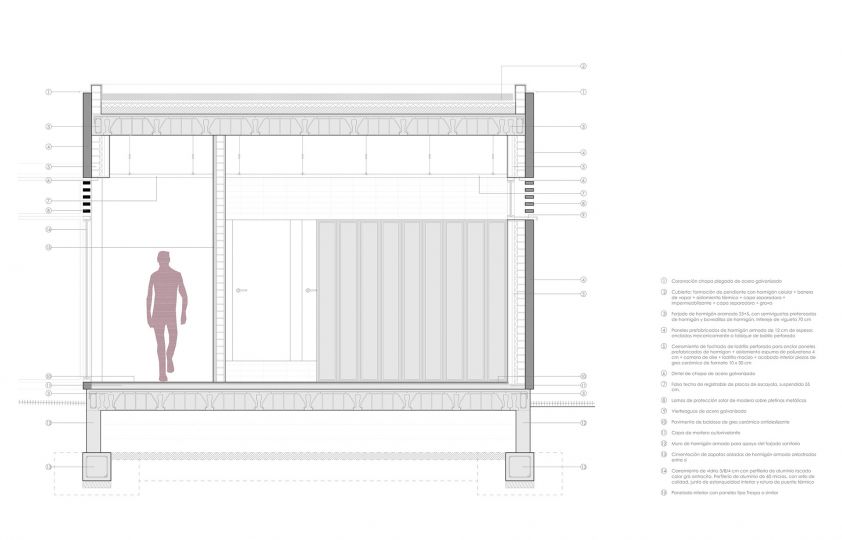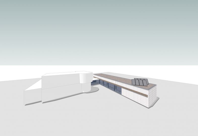 La materialidad del conjunto se basa en soluciones de construcción en seco para la estandarización del edificio e intentar eliminar costes superfluos. Todo del edificio se ha modulado para su fácil ejecución. La fachada es de paneles prefabricados de hormigón celular.