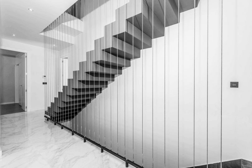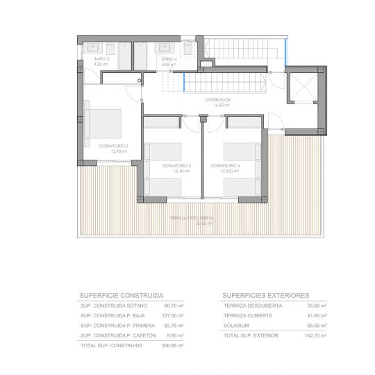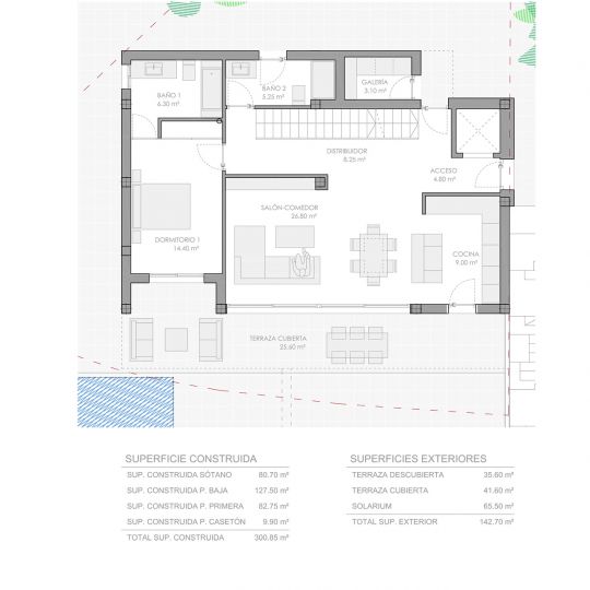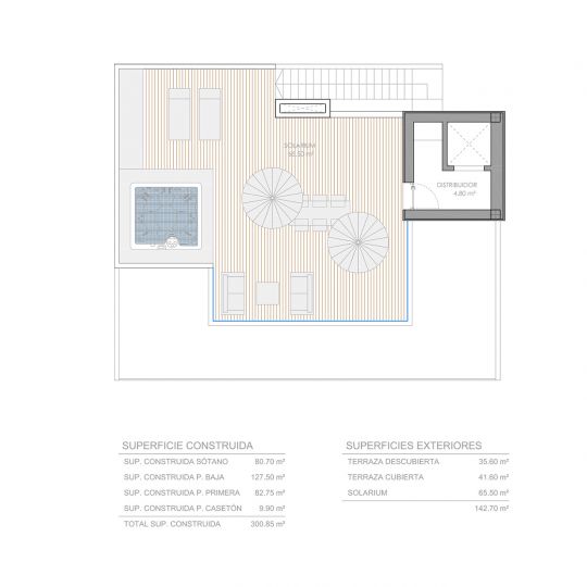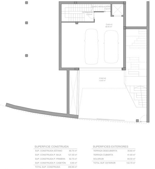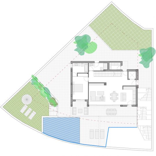 El importante desnivel existente en la parcela, permitió desarrollar una vivienda con una planta de acceso donde se sitúa el garaje y las plantas vivideras en niveles superiores. Así la planta principal se ubica a una cota muy superior a la de la calle, lo que permite abrirla completamente a las vistas del mar Mediterráneo; en esta planta un gran salón-cocina se abre a la terraza con piscina a través de enormes aberturas que posibilitan que el espacio exterior e interior sea continuo. En la planta superior se ubican las habitaciones y zonas de servicio. Para conseguir las mejores vistas hacia el mar se ha posibilitado la subida a la planta de cubierta, creando un salón exterior para las calurosas noches de verano.